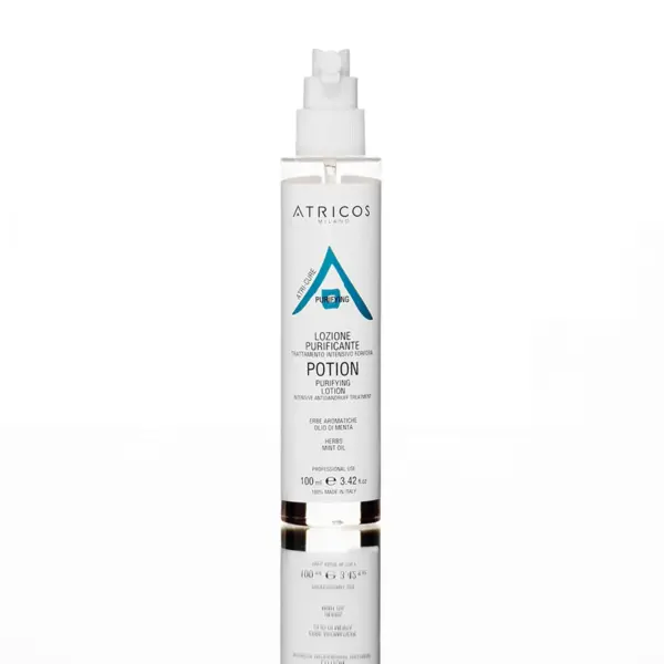 Atricos Potion Purifying Dandruff Treatment Lotion. Indicated as a post-treatment of Potion Purifying Lotion, thanks to its solvent functionality it completely removes dandruff from the scalp and hair, leaving them perfectly clean. Its formula, free of fragrance to make it more delicate on the skin, is able to retain the active ingredients present in the purifying lotion so that they can continue their effectiveness.