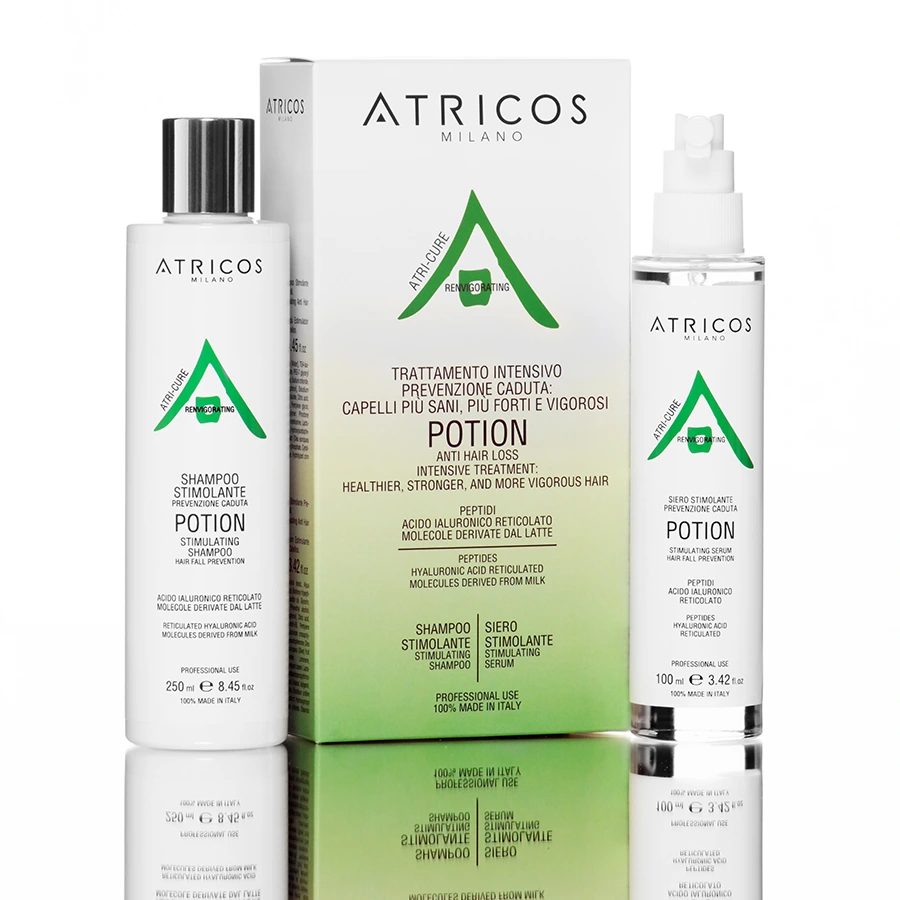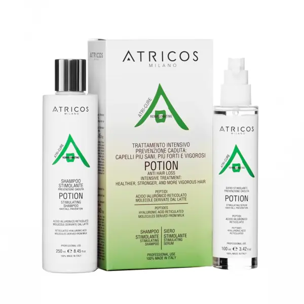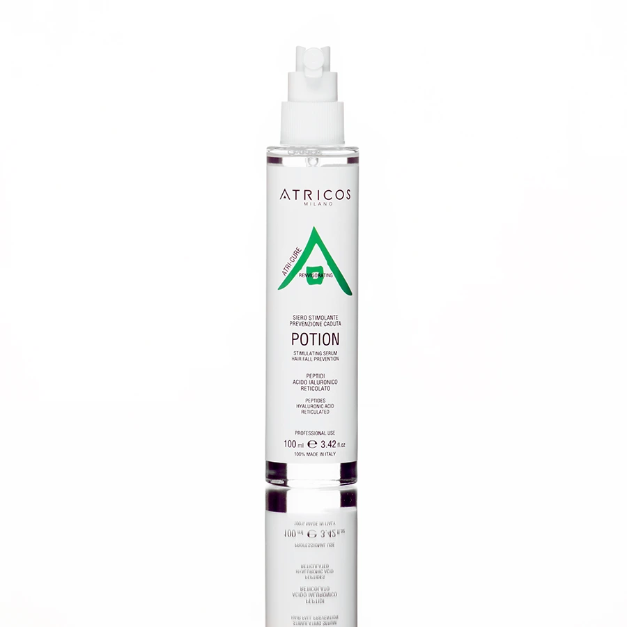 Atricos Potion, Siero Stimolante Prevenzione Caduta dei capelli. Prodotto leave-in con complesso di Peptidi e Acido Ialuronico Reticolato che stimolano le cellule del cuoio capelluto. Il suo sistema innovativo e brevettato è composto da una gabbia di acido ialuronico che racchiude e protegge i peptidi al suo interno. Essi, con meccanismo chiave-serratura, attivano i recettori delle cellule del bulbo potenziandone l’attività di crescita. La biodegradabilità enzimatica dell’acido ialuronico consente un rilascio graduale di peptide nel tempo. Inoltre, la presenza del mentolo migliora la circolazione sanguigna favorendo la stimolazione del bulbo attivo e prevenendone la caduta. I capelli risultano più nutriti e più vigorosi. Una fragranza energizzante contraddistingue il prodotto per le sue note principalmente agrumate e balsamiche.